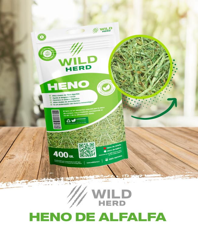 El Heno de alfalfa principal fuente de fibra en la alimentación diaria de Conejos, Chinchillas y Cobayas, correspondiendo al 70-80% de su alimentación diaria y por lo tanto se debe ofrecer de manera ilimitada.