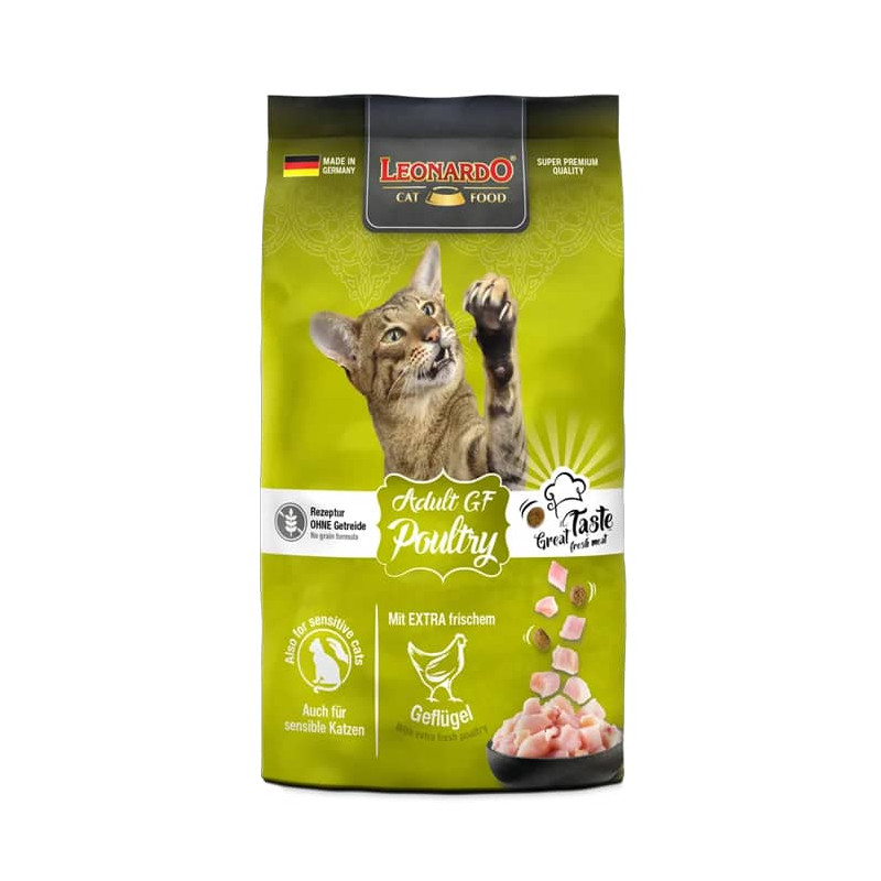 LEONARDO Adult Grain Free Poultry es un alimento indicado para gatos adultos con sensibilidad alimentaria o tendencia a padecer alergias. LEONARDO Adult GF Poultry está formulado con carne de ave fresca y no contiene gluten ni cereales. En esta composición el amaranto, rico en nutrientes, sustituye los cereales. LEONARDO Adult GF Poultry es la solución perfecta para gatos con intolerancias alimentarias. Porcentaje de proteína animal sobre el total: 80%